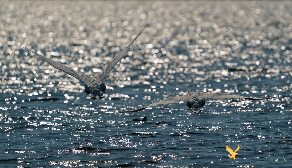 Sulla mia testa passa la star della giornata un passaggio fugace e veloce e purtroppo in controluce …il falco pescatore “Pandion haliaetus“. Il falco pescatore non è comune alle nostre latitudini attualmente se ne conoscono solo poche coppie stanziali e riproduttive in Italia , è presente adesso in quanto siamo nel periodo della migrazione. Effettua un volo a bassa quota sul lago facendo impazzire una moltitudine di folaghe, la mia speranza di vederlo tuffare e prendere la preda svanisce quando decide di tornare indietro..