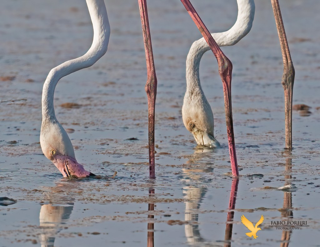 Phoenicopterus – Sono innumerevoli li vediamo sempre a testa in giù con il loro lungo becco curvo filtrando l’ acqua salmastra alla ricerca di cianobatteri e piccoli molluschi